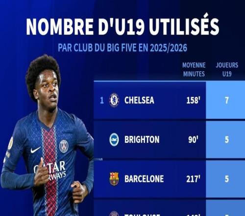 本赛季五大联赛U19球员切尔西使用人数最多,巴黎出场时间最多