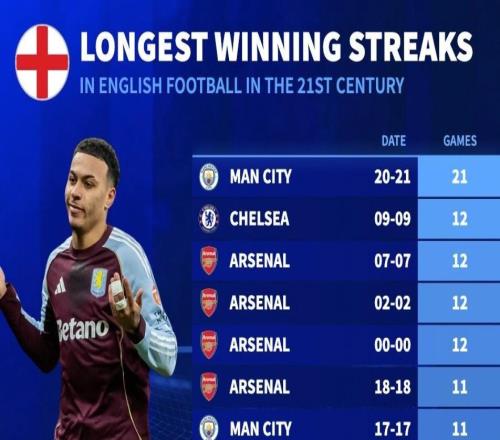 • 本世纪英超俱乐部各项赛事连胜纪录:曼城21连胜断档第一