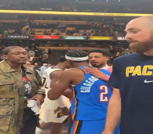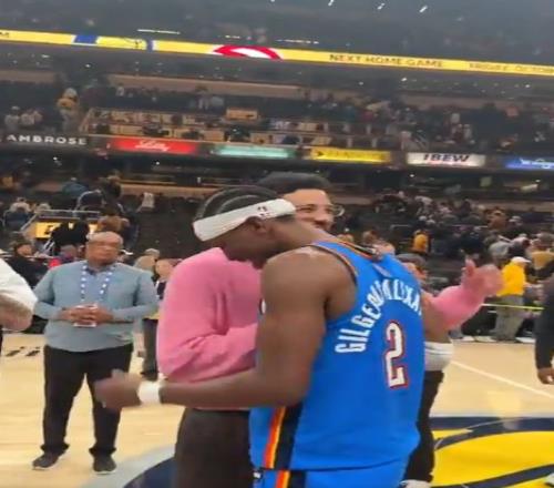 比赛结束后,亚历山大和步行者后卫哈里伯顿拥抱致意,两人有说有笑。